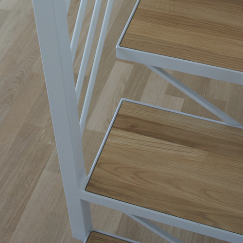 Sie stellt sich dar in Form einer verputzten Stahlkonstruktion mit Parkettboden. Die Treppe steht in der Verlängerung des Eingangsbereiches. Dadurch gewinnt die Wohnung an Struktur und Raum.